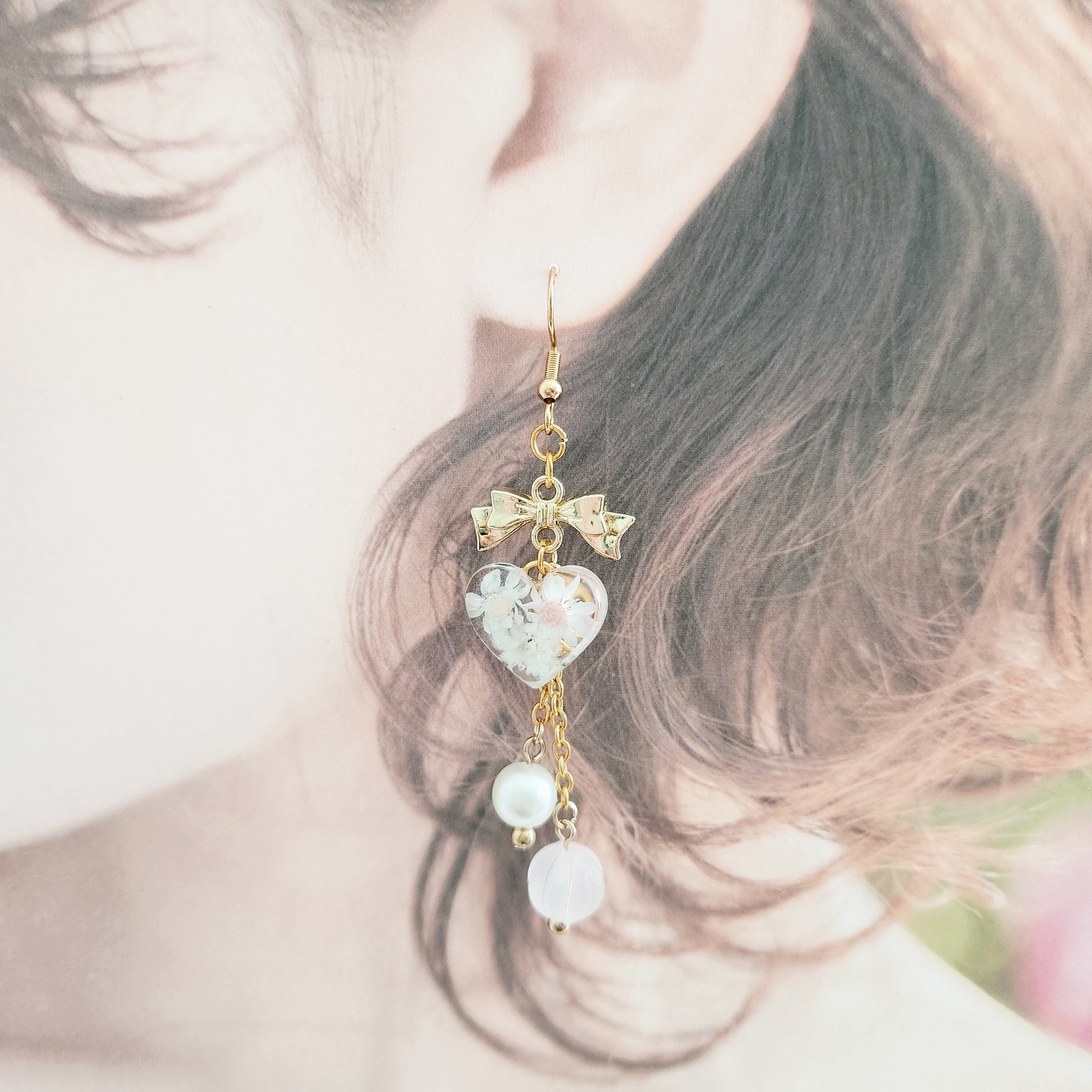リボンもレジンパーツもビーズも全部可愛くて、全部が主役の耳飾りです♡