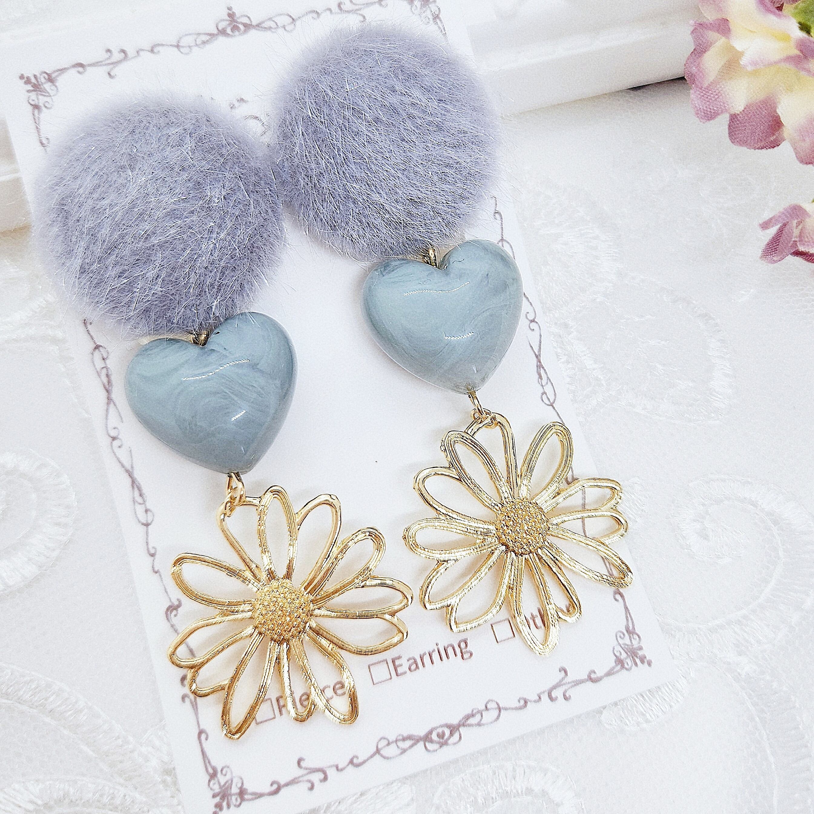 ビッグファーカボションとハート&マーガレットの耳飾り【グレー】୨୧ピアス/イヤリング